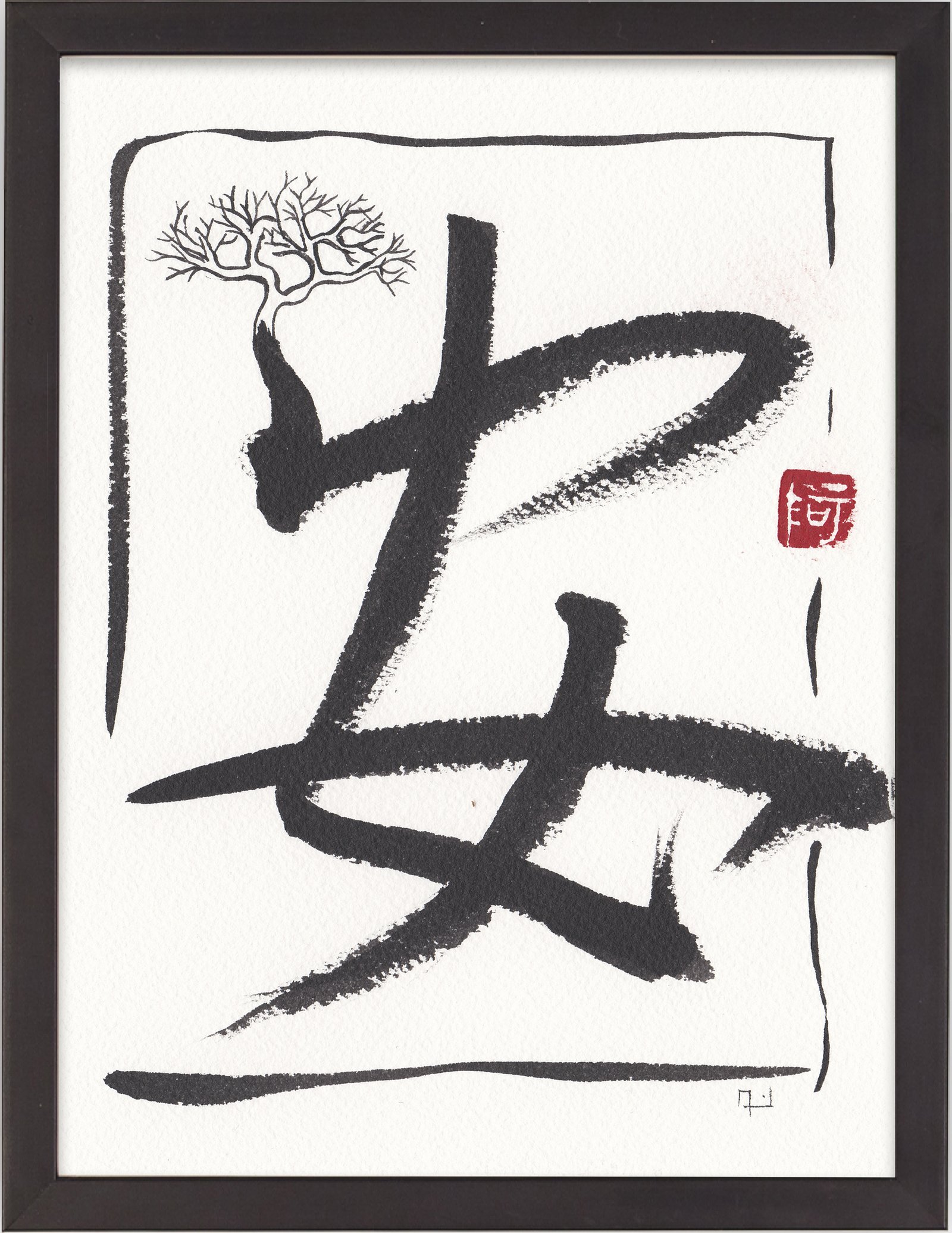Format de l'œuvre 15,5 x 20,5 cm. Format encadré 17 x 22 cm. Encre de Chine sur papier Arche 100 % coton 300 g/m2. Kanji : Sérénité. Style gyosho.