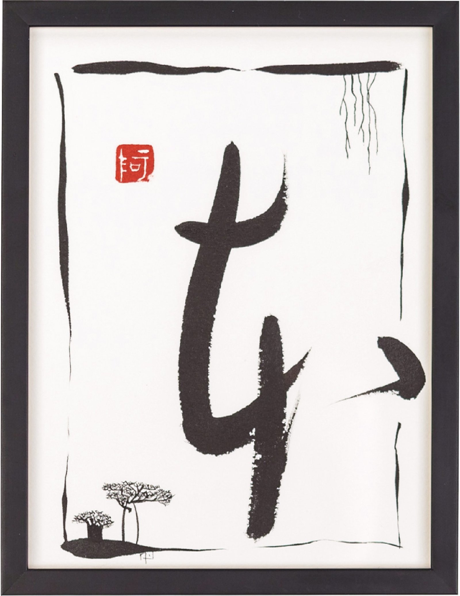 Format de l'œuvre 15,5 x 20,5 cm. Format encadré 17 x 22 cm. Encre de Chine sur papier Arche 100 % coton 300 g/m2. Kanji : Livre. Style sosho.
